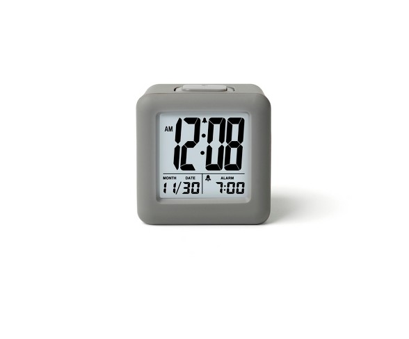 Description Wake up on time every morning with the Rubber Cube Calendar Smart Light from Timelink. Easy to fit on your nightstand, this calendar alarm clock features a large, easy-to-read time display and an innovative nightlight that adjusts to light or dark conditions. With large buttons to easily set your alarm, this digital clock adds cool personality to your bedroom.Dimensions (Overall): 3.1 inches (H) x 3.1 inches (W) x 2.3 inches (D)Weight: .45 poundsFunctions: AlarmAssembly Details: No assembly requiredDisplay Type: DigitalClock Face Color: Off-whiteFeatures: Electronics: Alarm clockMaterial: Rubber, GlassPower Source: Battery-poweredBattery: 2 AA, Required, not includedWarranty: 1 year limited warranty. To obtain a copy of the manufacturer's or supplier's warranty for this item prior to purchasing the item, please call Target Guest Services at 1-800-591-3869Perfect alarm clock for everyday useSits perfectly on your nightstandMade from durable rubber & glass Estimated shipping dimensions: 3.5INCH X 5.0INCH X 4.5INCH DPCI : 074-10-1835 UPC : 4897017375681 TCIN : 53499156 Estimated shippimg weight: 0.4POUND
