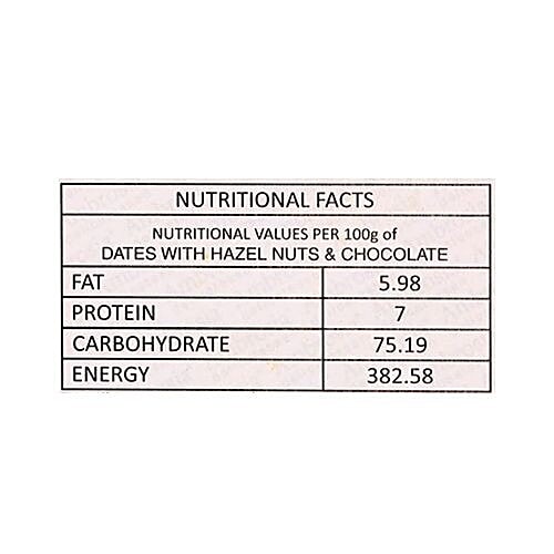 About @import url("https://www.desercart.com/static/froala_style_v2.min.css"); At Ambrosia Delicatessen, only absolutely genuine Dates are pitted, processed and packaged for ready consumption. No artificial flavours. Pure Vegetarian. These premium delicious dates from the Middle East are filled with two pieces of roasted Hazel nuts and piece of sinful Chocolate adding a tasty nutty layer to the date. Great substitute for chocolate cravers. Makes a healthy substitute for desserts. NUTRITIONAL VALUE FAT - 5.98, PROTEIN - 7.00, CARBOHYDRATE - 75.19, ENERGY - 382.58 Ingredients @import url("https://www.desercart.com/static/froala_style_v2.min.css"); Dates, Hazel Nuts and Chocolate