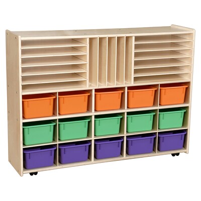 Description GREENGUARD® Gold certified. Versatile divided storage areas for puzzles, games, and books. Plus a generous storage area for (15) assorted pastel cubby trays. 100% Plywood, with mortise & secure fastener construction for exceptional strength and durability. Our exclusive UV Finish provides unsurpassed protection. Fully rounded corners and edges for maximum safety. 35-7/8"H x 46-3/4"W x 12"D. Fully assembled on casters. Lifetime warranty. Made in the U.S.A. Storage Unit with Trays Natural/Wood 35.875"H x 46 3/4"W x 12"D GREENGUARD® Gold certified. Constructed from 100% Plywood, and coated with our exclusive Tuff-Gloss™ UV finish. Promotes a healthier early learning environment Does not emit any harmful contaminants (VOCs) into a™osphere Unique mortise and hex screw construction is the strongest most durable joinery available Fully rounded corners and edges for maximum safety. Comes with manufacturer's Lifetime Warranty Specifications Brand : Contender Customizable : No Weight : 104.00 lbs. per Each