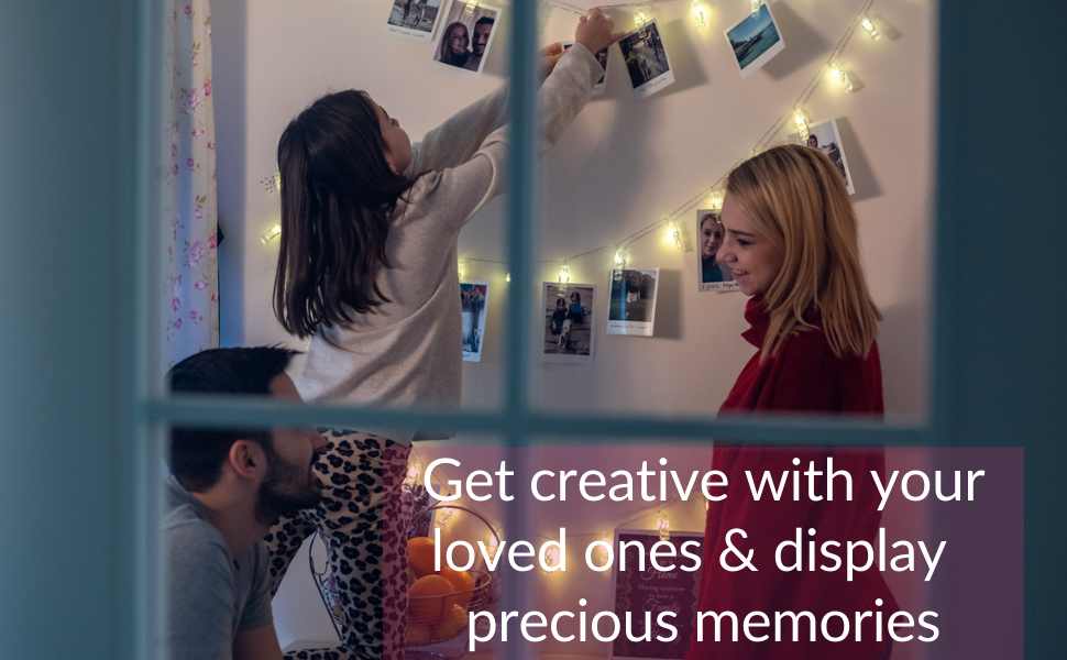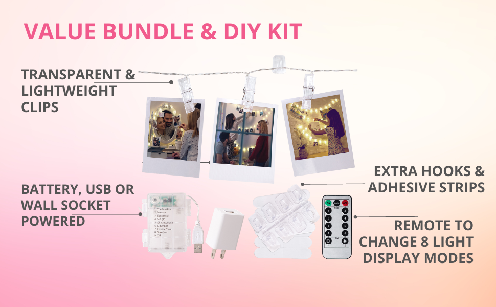 I love these photo lights . It’s great length and easy to put with commend hooks. The lights are bright and use a remote. They remote is awesome it has eight settings and so fun many fun options. It holds pictures in clips and they stay put. We have it in my daughters room and looks amazing. Great product.