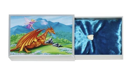Tooth Fairy Box with dragon and tooth fairy on top. Small and Flat To Put under your Child's Pillow. Measures 1-3/4" x 2-3/4". Plastic sliding drawer designed to hold a dollar bill. Blue Velvet Pillow With Indentation For Tooth. Made in The USA.