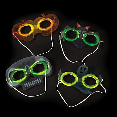 Sport your spooky spirit this fright night with this Glow Halloween Mask Assortment! Simply snap, shake and slip two of the 6 1/4" glow sticks into the mask to get glowing! Add these Halloween masks to your costumes or wear them as your costume! Mask designs include pumpkins, ghosts, skeletons and bats. Each mask includes a 14" stretchy band. Plastic. 6 1/2" - 7 1/2" x 3 1/2" - 4 1/2" Simple assembly required. Premium Glow items last up to 8 hours, are thicker and glow brighter than Value Glow products.