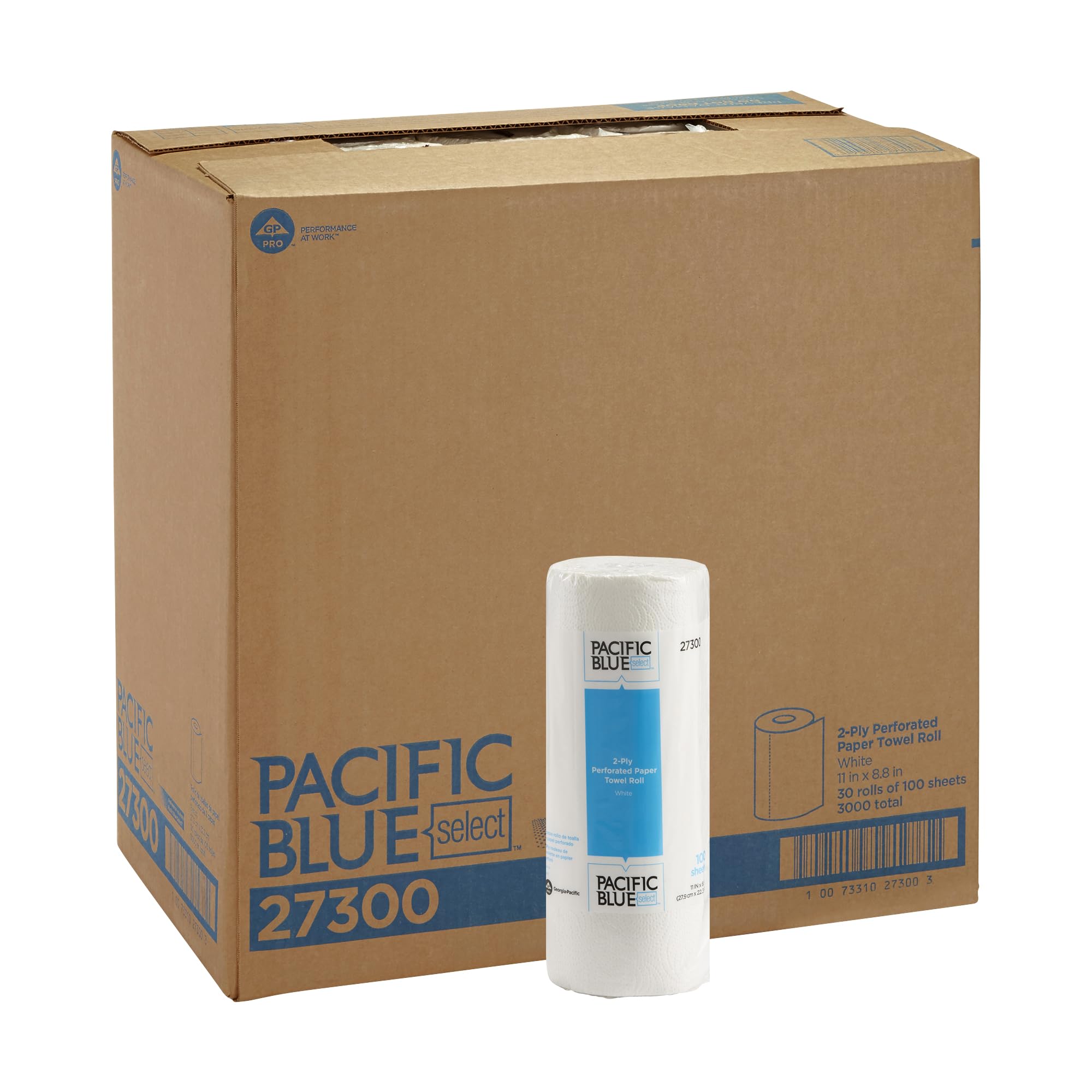 The Pacific Blue Select 2-ply perforated paper towel rolls by Georgia-Pacific offer superior absorbency with durable 2-ply sheets sized at 11" x 8.8". Designed for high-traffic environments, each case includes 30 rolls with 100 sheets per roll, made from biodegradable materials to support eco-friendly cleaning solutions.