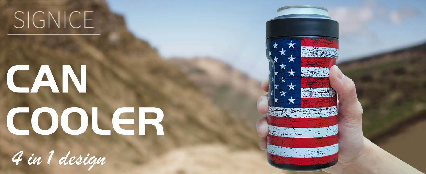 4-IN-1 Insulated Can Cooler with Lid - Newest Signice 12 Oz Stainless Steel Can Cooler Double Walled Vacuum Insulator for Skinny Tall Slim Can/Standard Regular Can/Beer Bottle (Flag)