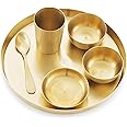 The ATTRO Satvik Kansa Bhojan Set is a 6-piece traditional Indian dining kit made from pure Ayurvedic Kansa metal, featuring a Thali, Glass, 2 Wati bowls, Sweet Dish, and Spoon. Designed to promote holistic health by balancing doshas and aiding digestion, it boasts a matte gold finish for a premium look. Handcrafted in India, this set supports a sattvic lifestyle and requires gentle hand washing with natural cleaning methods.