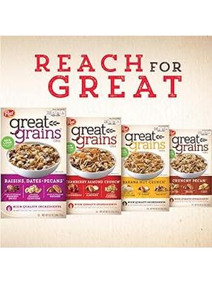 Great Grains Banana Nut Crunch is a delicious and nutritious cereal featuring a blend of crunchy flakes, real fruits, and wholesome nuts. Each 15.5-ounce box (pack of 3) is free from high fructose corn syrup and artificial additives, providing a fiber-rich breakfast option with 43g of whole grains and 12 essential vitamins and minerals per serving.