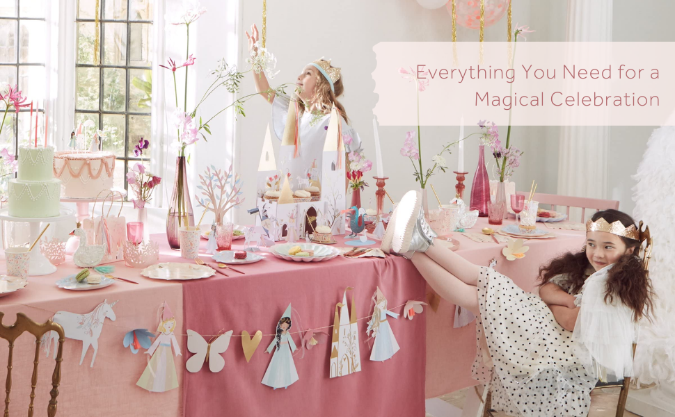 The Meri Meri Princess Party Garland is a beautifully detailed, two-piece paper garland featuring princesses, a castle, unicorn, and carriage. Crafted with organza, satin ribbons, and metallic threads, it offers a luxurious fairy tale aesthetic. Easy to hang and eco-friendly with FSC-certified packaging, it’s perfect for magical parties or enchanting everyday décor.
