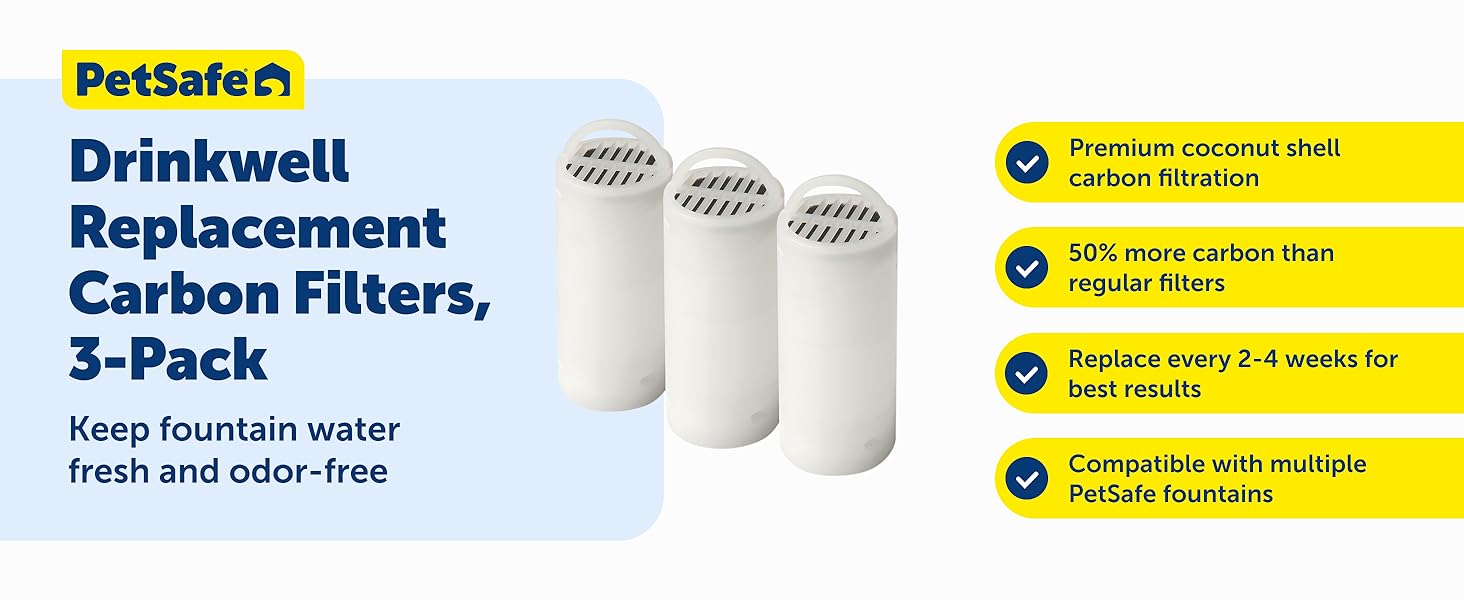 The PetSafe Drinkwell 360 Fountain Carbon Filters 3-pack offers premium, coconut shell carbon filtration designed exclusively for Drinkwell 360 fountains. Each cylindrical filter features a pull-tab for effortless replacement every two weeks, combining granulated carbon and a duo-density polyester pad to remove odors, bad tastes, and debris. Trusted by pet owners for over 25 years, these filters ensure clean, fresh water that supports multi-pet hydration and enhances your pet’s health and happiness.