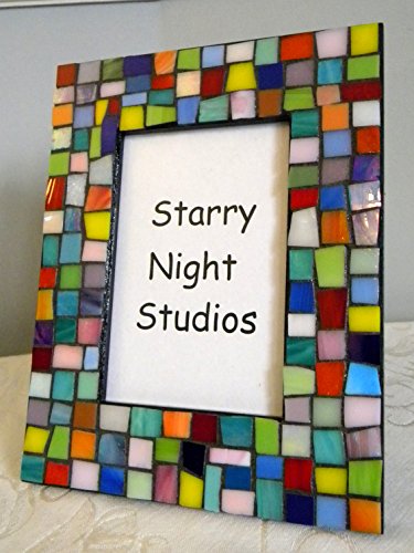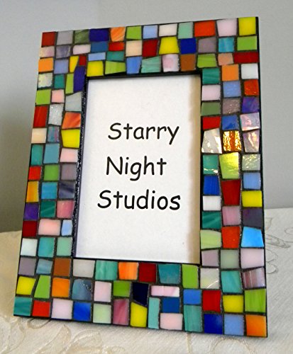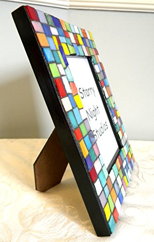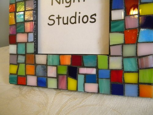 Beautiful stained glass mosaic frame in jewel tones and pastel shades of stained glass. Made from a recycled frame - 9 x 7 inches in size. Picture opening is 5-3/4 x 3-3/4 inches in size. Edges and back are painted black. Grouted in charcoal black and sealed. Ready to display on a mantel or table. Signed on the back.