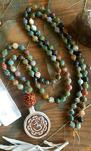 This 108 Bead Mala features a natural Indian Rudraksha Seed guru bead, matte Indian Agate 6mm beads, copper Czech glass seed beads (spacers), and a handmade Om / Ohm Clay Amulet. The 108 beads are strung on natural hemp cord. This mala measures approximately 35" long. Thank you for visiting my shop and please don't hesitate to contact me with questions regarding this piece! INDIAN AGATE Agate is a stone of harmony, balance, courage, protection, healing, and calming. Historically it was placed in water for cooking or drinking to dispel sickness. Agate is known to enhance mental clarity and improve concentration and perception. It soothes and calms, healing inner tension and promotes a sense of security and safety. Indian agate resonates with and tonifies the seven chakras.