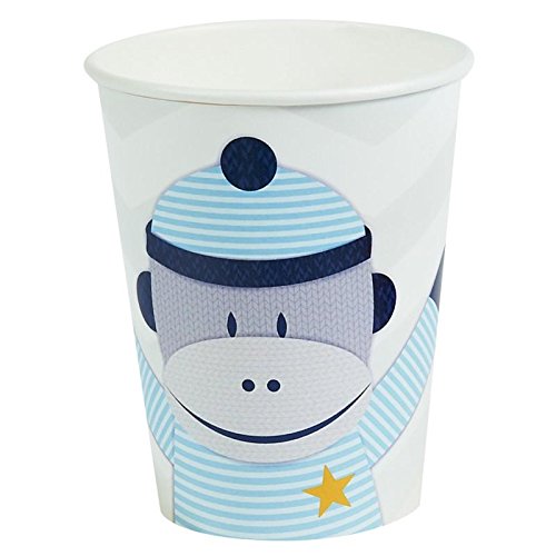 (16) Blue Sock Monkey 9 oz. Beverage Hot/Cold Cups; (20) Blue Sock Monkey 6.5x6.5 inch 2-Ply Napkins; (16) Blue Sock Monkey dessert round Plates; (24) Blue Sock Monkey Stickers; (12) Blue Sock Monkey Cupcake Wrappers; (16) Blue Sock Monkey Invitations, (16) White Envelopes.