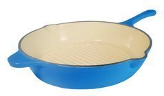 Enameled Cast Iron. Interior: Enameled Beige. Exterior: Enameled France Blue., Flat bottoms are enameled as the france blue exterior., Safe on all cook tops and in the oven to 500 degrees F. Dimensions: Length19 1/2"x Diameter12"x Depth3"., No seasoning required. Hand wash.