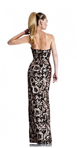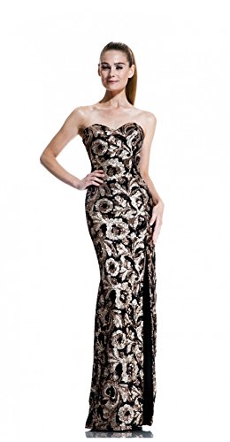 Make your grand entrance count in this Johnathan Kayne 517 evening gown. This strapless gown boasts a demure sweetheart shape. The fitted gown has a long hem and slit at one side. Ornate abstract flowers shine throughout the gown, creating a glamorous take on the feminine print.