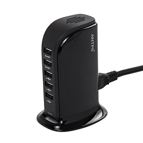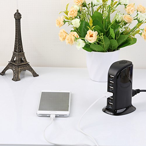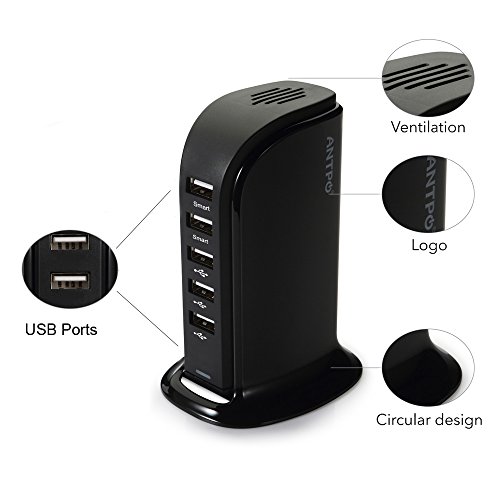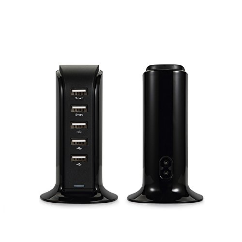 Family-Sized Desktop USB Charger Say goodbye to using multiple adapters & outlets. Say hello to all-in-one charging convenience. With 5 ports, don't choose between your devices or hunt for spare adapters, just plug everything in at once Compact Design This charging station is small(4.1" x 2.2" x 0.9") and lightweight(220g), ideal for home or travel use. All in one body design slides easily into a bag or pocket. Compatibility Port 1&2: Dual port with IC intelligent recognition can charge most devices automatically and charge at full speed, like iPhone, iPad, iPod, iPad mini and other smart phones Port 3&5: Compatible with all Smart phones Android /Windows Devices. Like e-reader, Bluetooth headphones, Smart watches, Cameras, portable speakers and nearly any other device that charges with a USB cord Safety ETL, PSE, CE, FCC and RoHS certification, prevent overcharge, over current, overvoltage, overheating, short circuit etc. Specification Input: AC 100-240V 50/60Hz Max Output In Total: DC 5V 6A Max Output Per Port: DC 5V 2.4A Power Cord Length: 5ft Product Size: 4.1" x 2.2" x 0.9" Certification: ETL, PSE, CE, FCC and RoHS Package: -1x 30W 5 Ports Charger -1x Power Cord -1x User Manual Warranty 12 months warranty and friendly customer service, buy with confidence