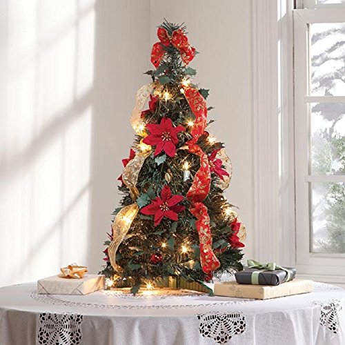 Pops up with everything in place: 35 clear incandescent lights, 8 ornaments, 8 faux poinsettias, 10 1/2 feet of ribbon and 1 festive bow topper. Simply place this pop-up tree in the sturdy plastic stand, pull it up, plug it in and enjoy! When the holidays end, it collapses just as easily ... storing fully decorated and ready for next year. The 24" high x 12" dia. collapsible Christmas tree features durable plastic ornaments. Lights are UL® listed for indoor/outdoor use. 35" cord. PVC/metal/wire.