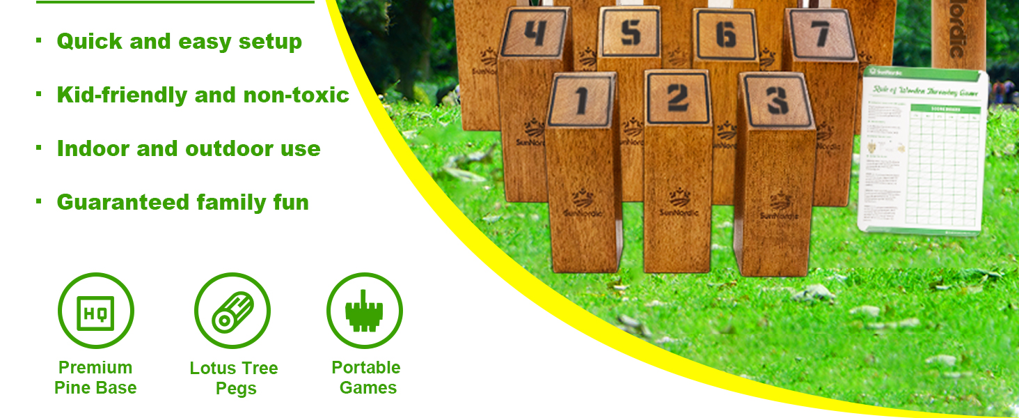 The SunNordic Wooden Throwing Game Set features 12 durable, numbered rubber wood pins, a throwing dowel, and a scoreboard, all housed in a portable carry bag. Designed for both indoor and outdoor use, this all-weather game set offers strategic fun for 2+ players, making it the perfect addition to family gatherings, parties, and outdoor events.