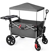 This wagon has been such a great investment for our 2 year old. There is plenty of room in it for him to squirm around, play with his cars, eat, and nap! As for the parents it has plenty of storage for diapers, wipes, snacks, toys, drinks, etc. It steers very easily I have never had trouble pushing it around at all. I love that you can either push it or pull it, most of the time I push it. I love that it has the canopy for when it’s too sunny and the little one needs shade or when it’s raining. If I had to think of one complaint it would be the weight. It’s a little heavy but with everything that it has it’s going to be. The big tires that help get it everywhere and the storage is going to cause it to be a little heavier. But it’s worth it. This is probably one of the best purchases we’ve made and we’ve had it for I think almost a year now and have used it plenty. The only time I use the stroller is when I know the area we are going to his small like a small drs office. Other than that it’s always the wagon. Everyone comments about him riding in style and luxury!