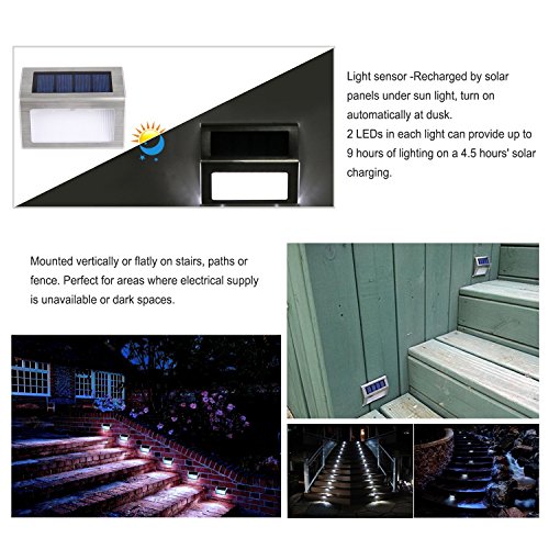 Environmentally friendly: Solar string Light can turn the solar energy into electricity, which can be stored in the built-in battery. Solar panel and rechargeable battery charge under sunshine and turn on at dusk automatically. Easy to install and operate Liqoo solar string light illuminates at night, much easier to install and operate, ideal for decorating your gardens, patio, lawn, porch, gate, yard, etc. Features: Weight: 637g Wattage: 0.12W: 2Pcs LED x 0.06W Each light of Size: 100 x 23 x 83 mm / 3.93 x 0.91 x 3.27 in Package size: 21 x 11 x 5.5 cm / 8.27 x 4.33 x 2.16 in Working Time: 6-9 hours ( battery fully charged: about 4.5 hours ) Rechargeable built-in batteries: 1.2V / 700mAH AAA Ni-MH Color temperature: White 6000K; Lumen: 12W Solar panel: crystalline silicon Material: Stainless steel + ABS + PC Note: 1. Turn the on / off button to "on". 2. Fix the screws on the place you want to install the light. 3. Put the light on the screws. 4. Tear off the protective film from the solar panel if it has. Package Included: 6 x Solar Powered Stair Lights 【About Liqoo】 Satisfaction guarantee: We offer 3 years warranty. We are extremely committed to our customers. If you have any question, just feel free to contact us. We will reply you within 24 hours.