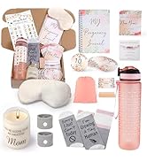 This is a package of luxury gifts for a newly expectant mother. It specifically mentions the first trimester, but the things in this box would be great all the way through pregnancy. There is a water bottle that has marks for the amount of water you need to drink, there’s a journal to fill out, there’re stickers that show you the size of your baby every week, There’s an eye mask to help you sleep, cards of affirmation, Wrist bands to help with morning sickness, a pair of new mama socks, a candle… whoever compiled this box did an excellent job. If you know anyone who’s expecting or plans to become expecting, this is the box to buy them! Love it! 🥰