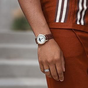 ムーンフェイズウォッチは、自然とつながる特別な方法です。 時間を伝え、月の満ち欠けをチェックするための特別なタッチを与えることができます。 この傑作時計は、両方の長所を可能にします。 月の満ち欠けは大きく、とてもカラフルです。 白い文字盤に大きな数字で読みやすくなっています。 ゴールドトーンのケースセッティングで、クラシックなスタイルが生き生きとします。 茶色のレザーバンドがケースに付随し、アーストーンの外観です。 この時計は、日常の装いやクラシックな日曜日のくつろぎに最適です。 特徴 クラシックブラウンレザーウォッチ ゴールドトーンケース バンドカラー:ブラウン 文字盤カラー:ホワイト ケース直径:38mm バンド幅:20mm ケース厚さ:10mm メーカー限定永久保証